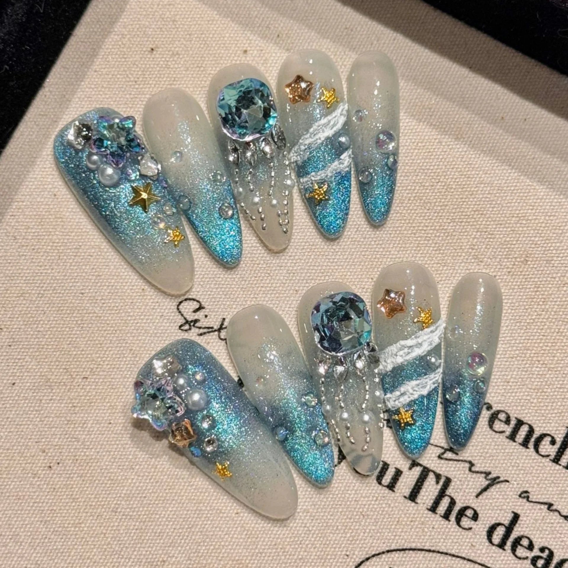 Glitter Cat's Eye Fake Nails Long Almond Gradient Blue Handmade Press On Nails With Butterfiy Designs Gentle Wearable Manicure